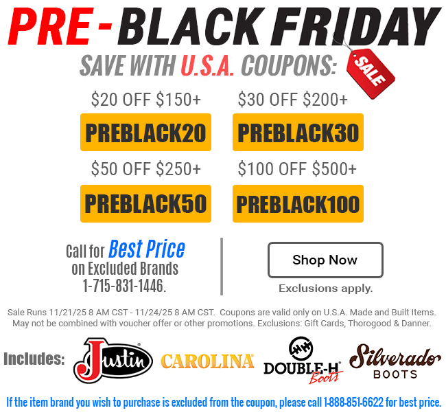 Sale Runs 11/21/25 8 AM CST - 11/24/25 8 AM CST. Coupons are valid only on U.S.A. Made and Built Items. May not be combined with voucher offer or other promotions. Exclusions: Gift Cards, Thorogood & Danner.